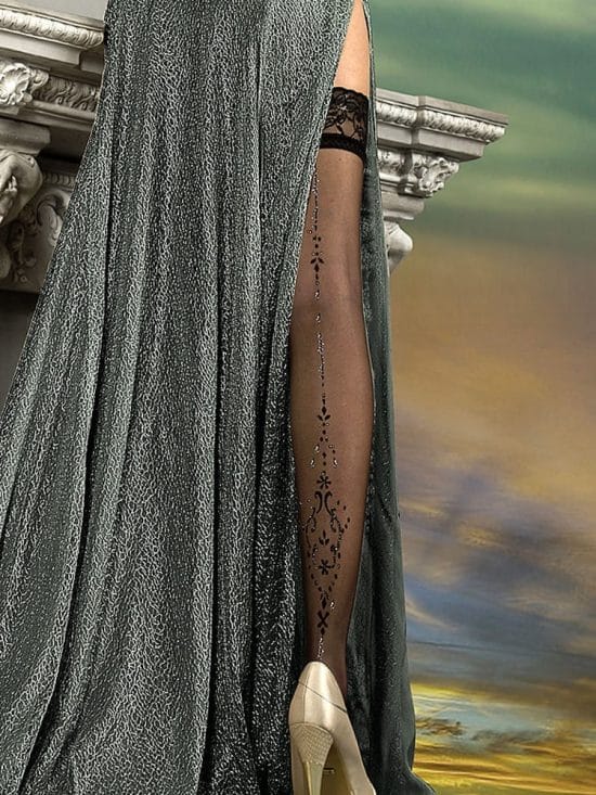 A beautiful pair of plus size hold ups in Nero (Black) which have sparkling embroidery at the top of the leg and near the bottom created from delicate metallic thread. A beautiful floral embroidered lace trim features at the top of the hold ups with two silicone strips included on the inside. All items are presented in luxury embossed packaging branded by Ballerina.