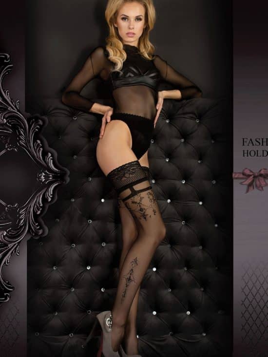 A stunning pair of plus size hold ups in Nero (Black) which have a gorgeous design embroidered at the top of the leg and near the bottom. A beautiful floral embroidered lace trim features at the top of the hold ups with two silicone strips included on the inside. All items are presented in luxury embossed packaging branded by Ballerina.