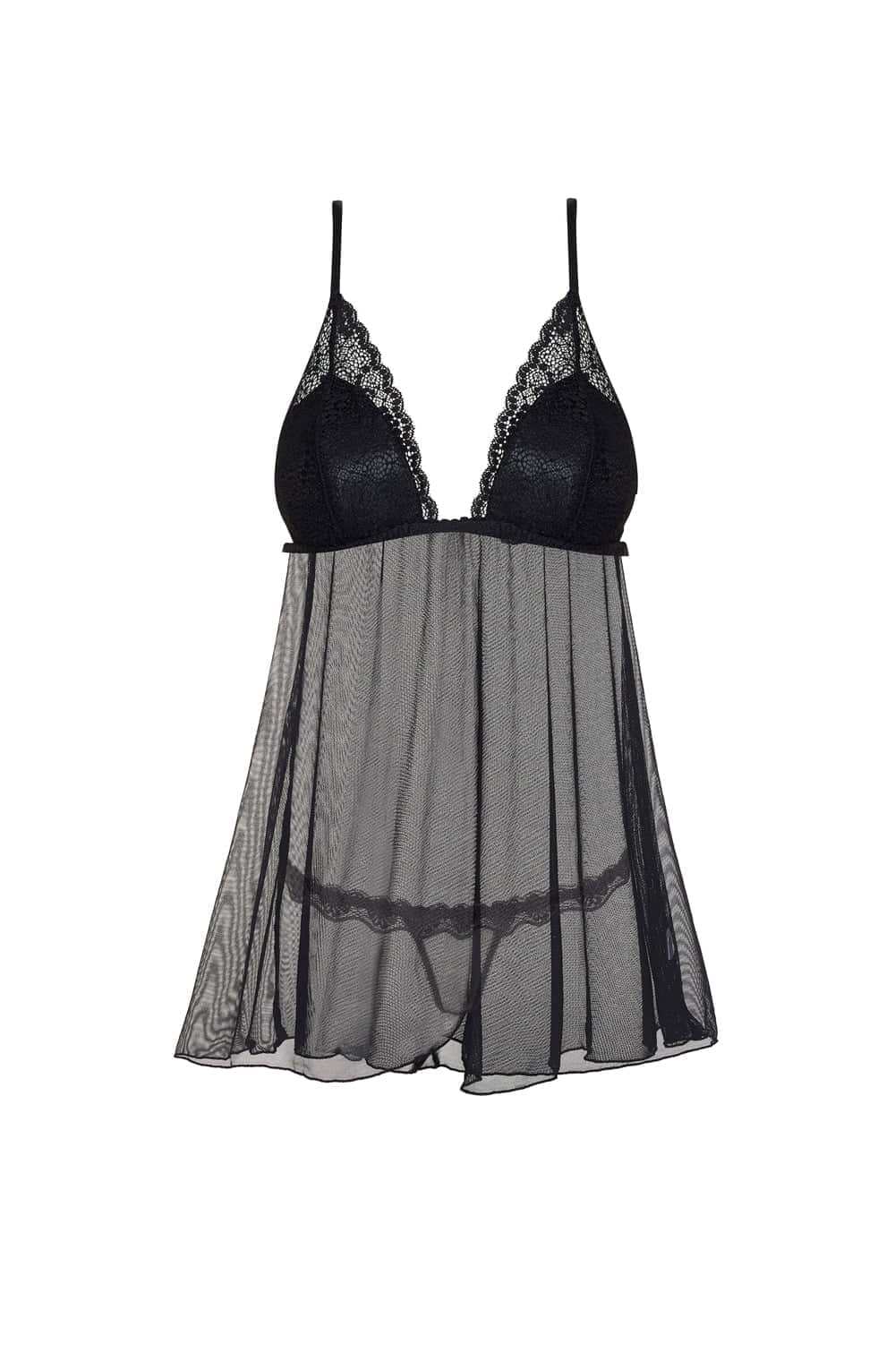 Indulge in the allure of this very exclusive yet sensual and provocative black chemise crafted from tulle and lace. The chemise features decorative, shaped cups and adjustable shoulder straps for a perfect fit. Complete with tulle thongs adorned with lace, this set exudes sophistication and allure. Presented in elegant packaging featuring a picture showcasing the product, it bears the hologram of the Beauty Night Fashion logo for authenticity. Also included is a convenient bag-pouch for storage or laundry.
