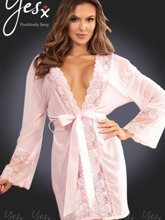 The sophisticated Samira peignoir in black embodies both luxury and comfort, ideal for romantic evenings or relaxing at home. Key features: Crafted from smooth, shiny fabric that gently hugs the body Wide, airy sleeves for a touch of lightness and elegance Waist belt to accentuate the silhouette Comes with a matching thong and belt A perfect gift for a loved one or a treat for yourself Elegantly packaged with an image showcasing the product.