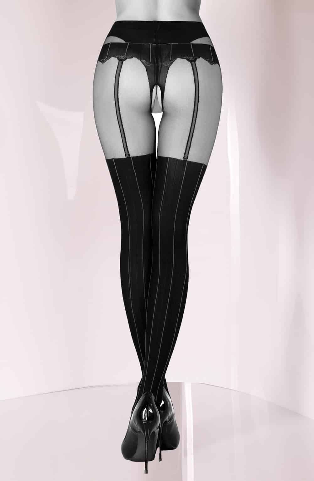 Introducing our Black Crotchless Tights with Bordeaux Pin Striping, Faux Suspender Belt, and Brief –Adorned with a faux suspender belt and brief detailing, they offer a daring yet sophisticated look. Perfect for adding a touch of glamour to any outfit or intimate occasion. Packaged in our sleek black Secret branding, they’re ready to elevate your style with unmatched sophistication and charm!