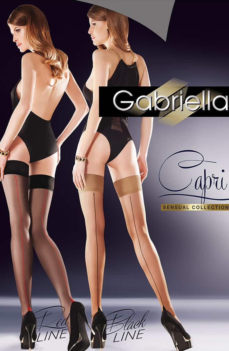 An exclusive sexy pair of fine holdups in nero (black) with contrasting red Cuban heel and back seam (Red Line). Silicon tops for comfort and fit. Invisible Toe.