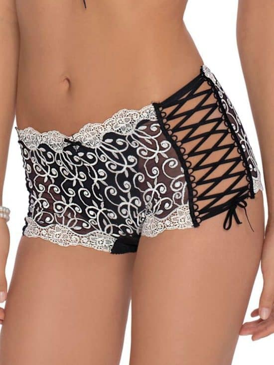 Sublime and chic Soiree Intime Shorty Set is a 2 piece set comprising of Bra and matching Shorty Brief. High quality material half-cup bra adorned at the cleavage with a stunning silver and rhinestone pendant. The adjustable straps are thin and delicate. The brief has cute ruffles on the side. This item arrives packed in a Provocative box.