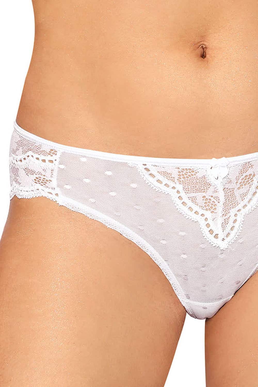 A beautiful brief with a pretty bow in the centre. The brief features a gorgeous lace V shape in the centre that carries through along the trim and back of the brief.  A transparent mesh with subtle pretty polka dots has been used to decorate the front of the brief and gusset. This item arrives packaged in a lovely Roza box making it ideal as a gift or special treat. The Lagerta collection comprises of a push up bra, soft cup bra, thong or brief all available in black or white. Each piece is sold separately to maximise the mix and match options. Please see the ‘Related Products’ tab below to see other combinations.
