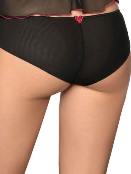 A simple but absolutely sexy brief from Provocative which has the softest touch and delicate detailing. Divided into panels the front has two side panels which are made up of sheer floral lace with black pipe criss-cross material on top. The back of the brief has a v-shape panel with scalloped lace sewn. Inside the brief is a cotton gusset. Comes packaged in a branded Provocative box.