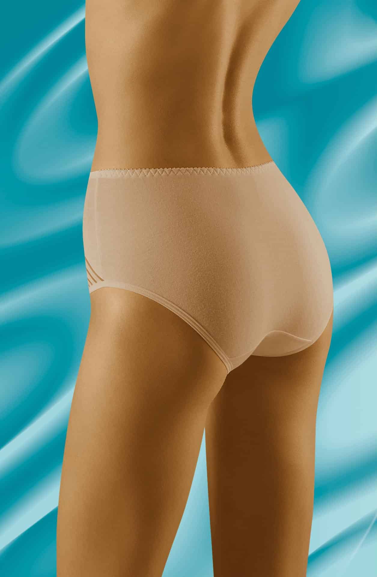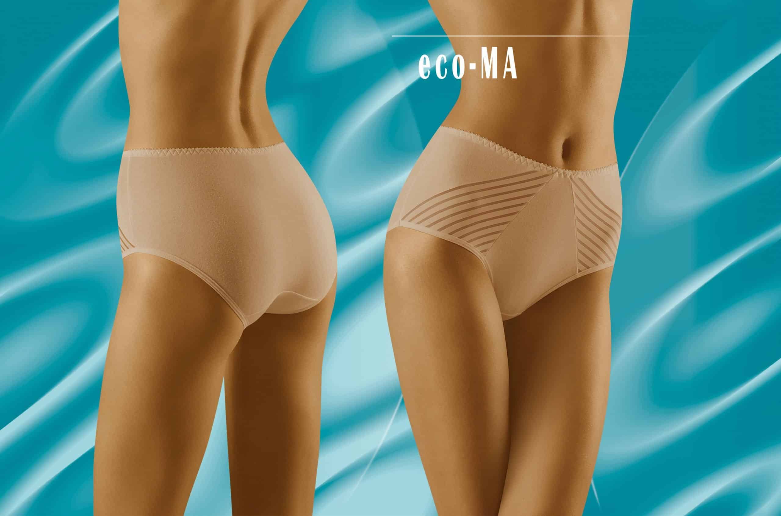 Eco-Ma is a wonderful pair of briefs made from high quality cotton. The front of the brief features two panels at either side with an exceptional stripe design including a mixture of sheer fabric and cotton. This makes the panels semi-transparent which are beautifully finished at the edges. The waistband is elasticated and super stretchy making this brief exceptionally comfortable for women with a large difference in waist circumference. These panels are delicately overlocked at the seams on the inside. Inside is a cotton gusset which is sewn into the brief. The back of the brief is completely plain. Smooth feel. Available in white beige and black and can all be ordered separately on the website. This item arrives packaged in a branded Wolbar box presenting an image of the product.