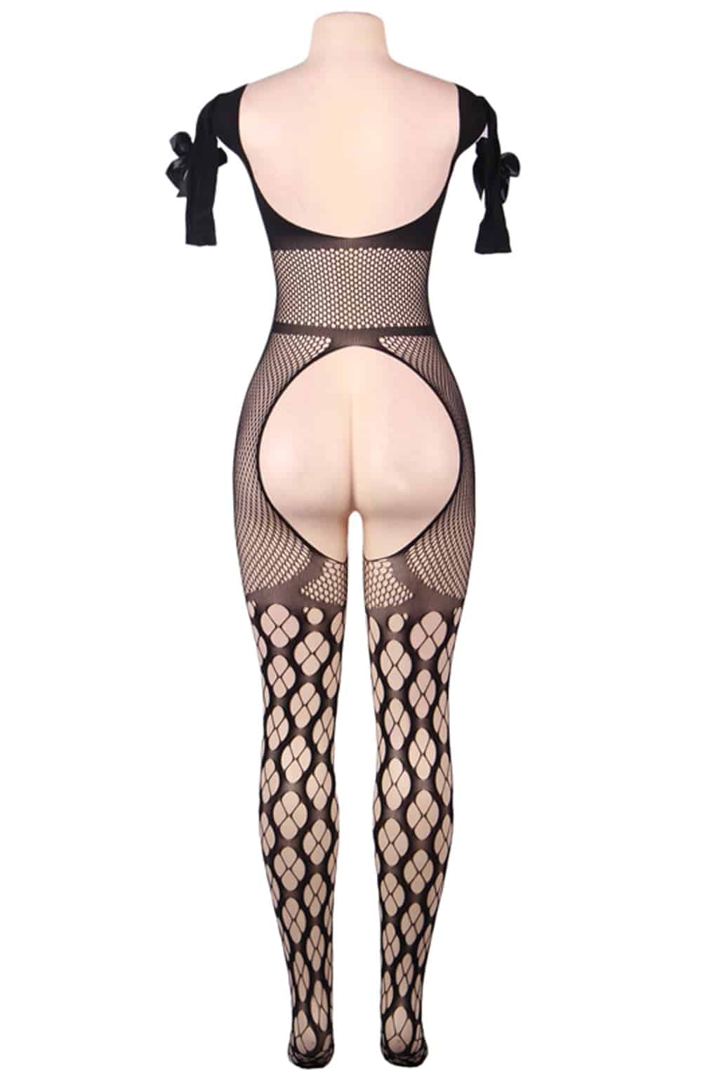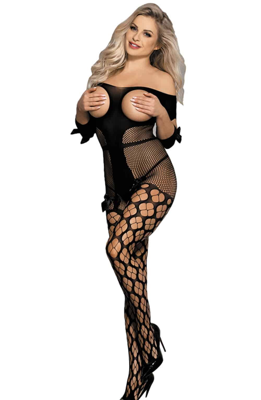Pretty boobless bodystocking with different complementary patterns. Three quarter sleeves and bows! Item arrives boxed. Please note the thong is not included.