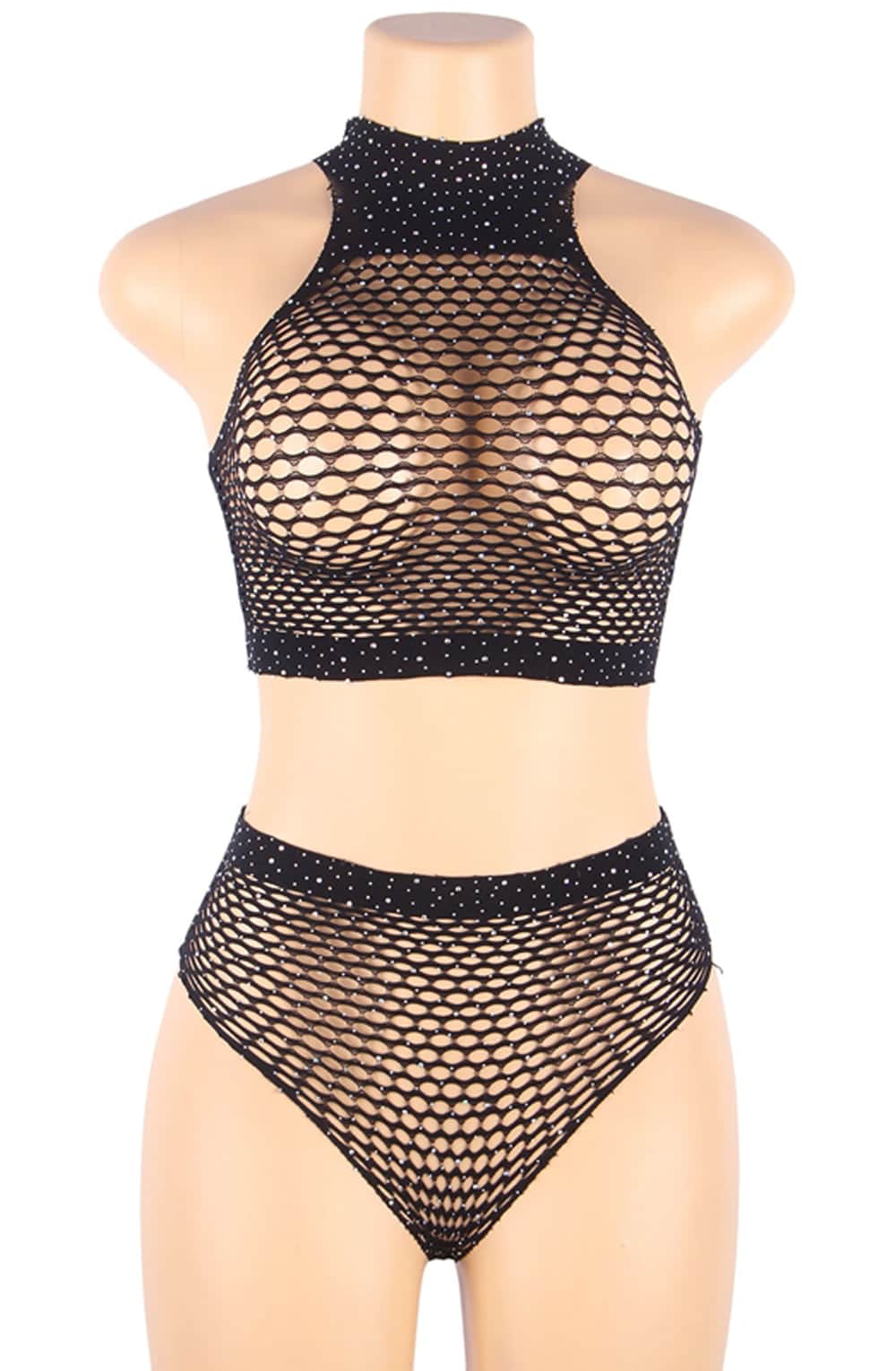 Shimmering halter neck bra top and brief in fishnet style design. Item arrives packaged making it ideal as a gift or treat.