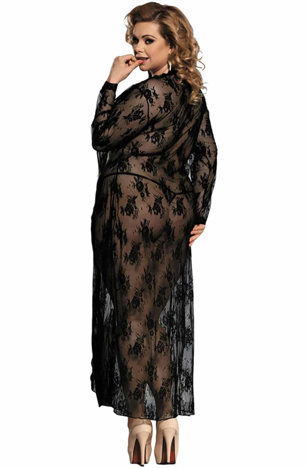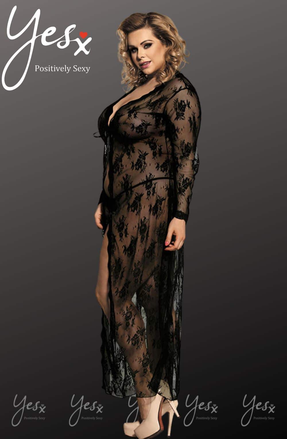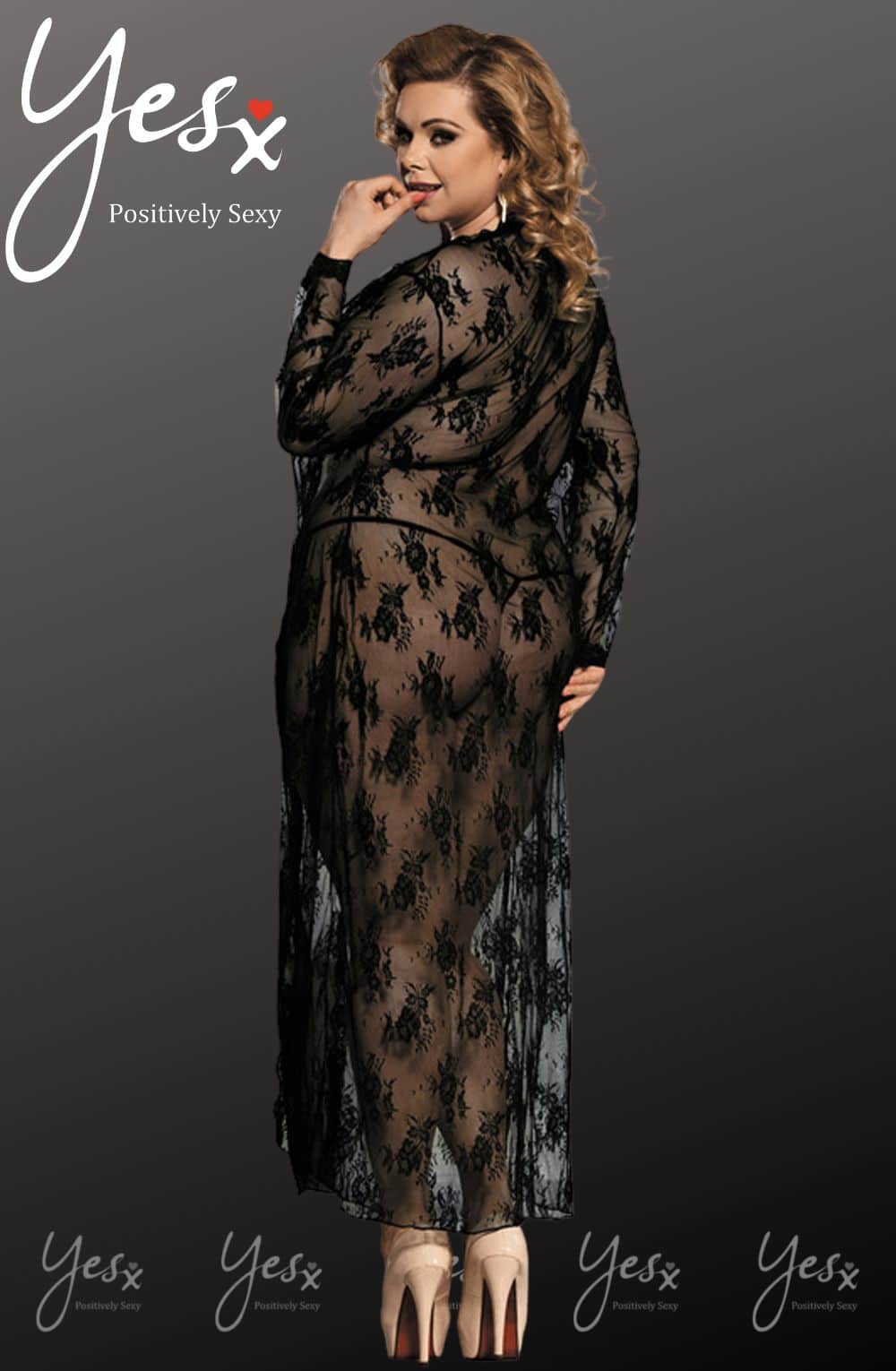 Long lacey dressing gown in black with matching thong. Ribbon tie front.  Item arrives package.
