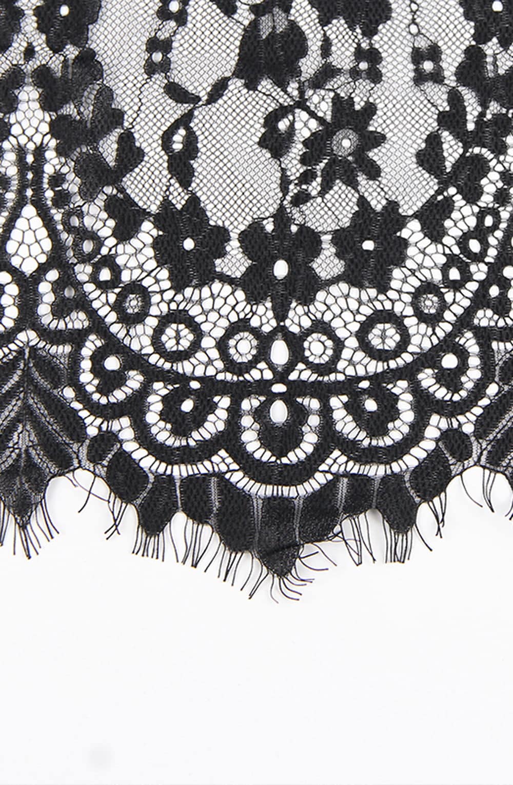 A Stunning long lacey long sleeved nightdress gown in black with floral design. Beautiful eyelash lace detail on the neckline and cuffs. Matching thong is included. This item arrives packaged in a Yesx satin bag.