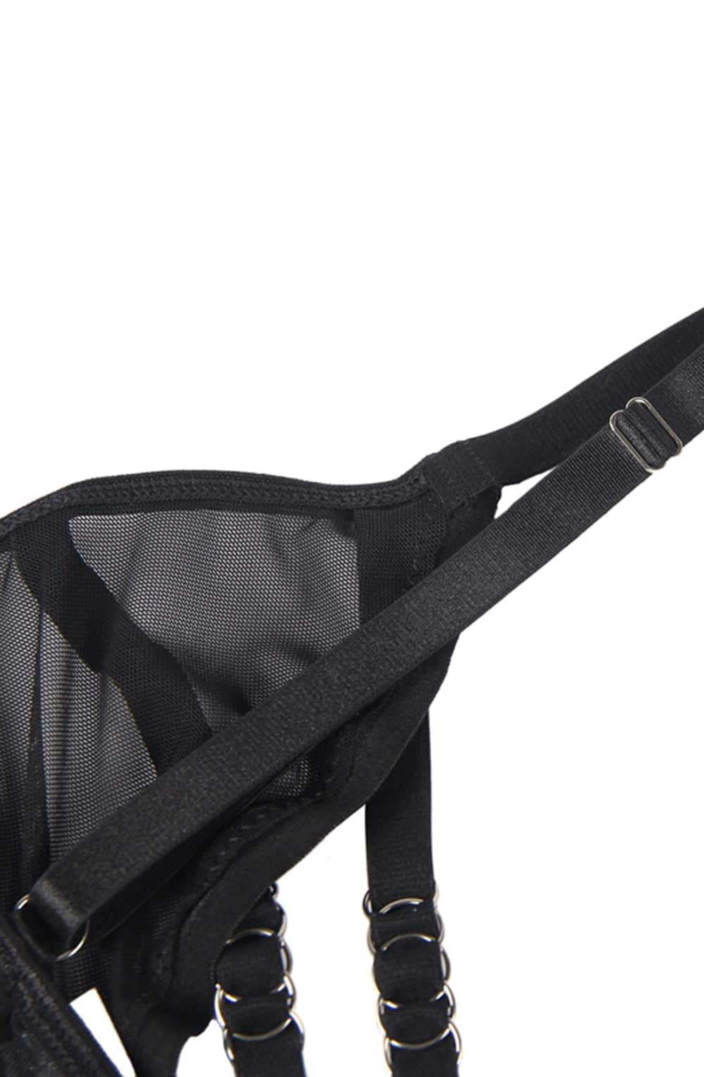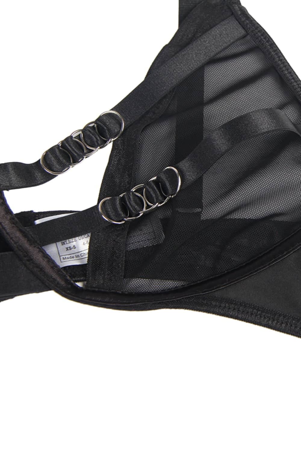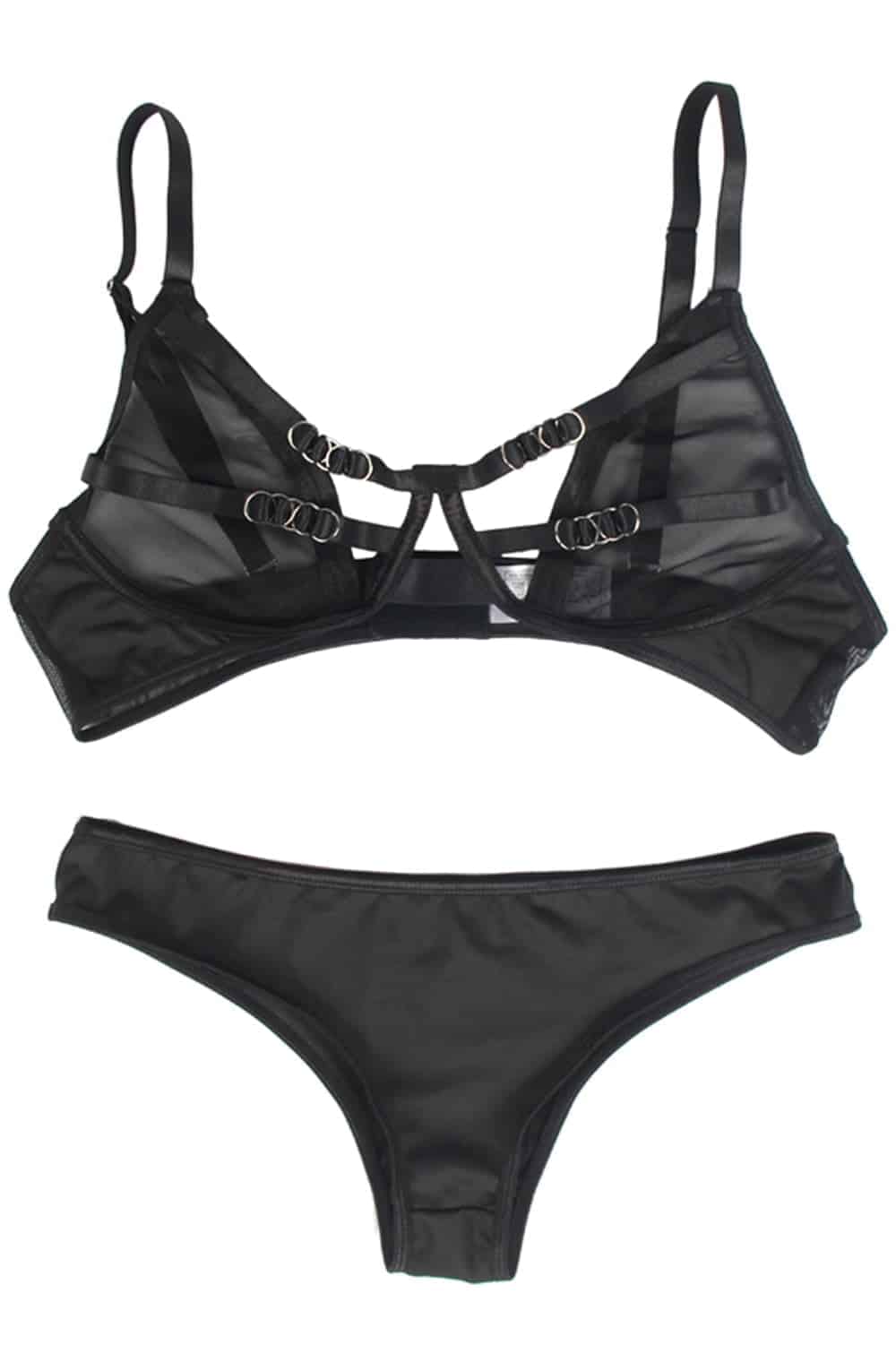 Black bra and brief set. The bra is decorated with a ring design and is not underwired. Fully adjustable for perfect fit. Item arrives packaged.