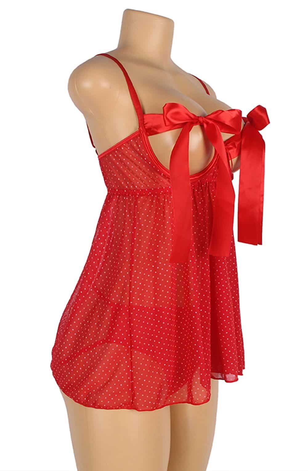 A sexy red and white polka dot babydoll with matching cage back brief. This floaty little number is open busted with red ribbon bows. Item arrives packaged making it ideal as a treat or gift.