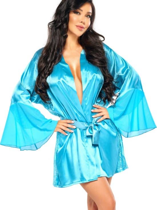 A stunning floaty gown which is edged in black lace and ties at the front with a satin belt. The matching thong is included.  Item arrives packaged in a Yesx satin bag.