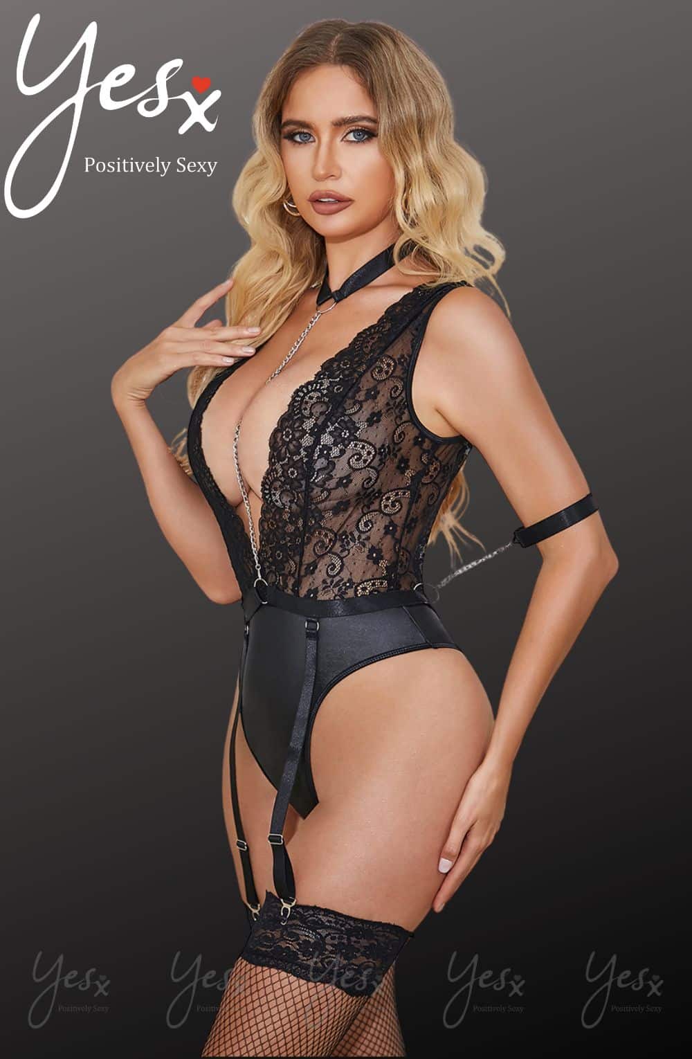 Introducing our Black Deep V-Neck Faux Leather Bodysuit – a daring blend of seduction and sophistication. The plunging neckline, lace and faux leather material create an edgy allure, while the bondage chain kit around the neck and arms adds a provocative twist. With adjustable suspender straps, this bodysuit offers a customisable fit to enhance your curves. (Note: Stockings not included, available separately.) Make a bold statement and unleash your confidence with this captivating look. Unique look with chain kit Lace & faux leather Adjustable suspender straps Packaged in a YesX satin bag