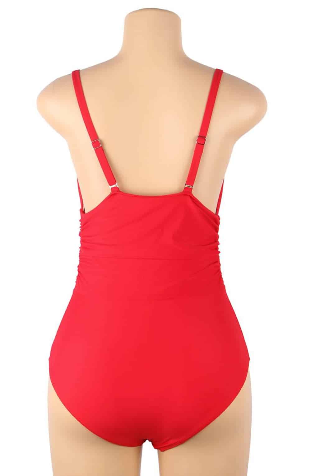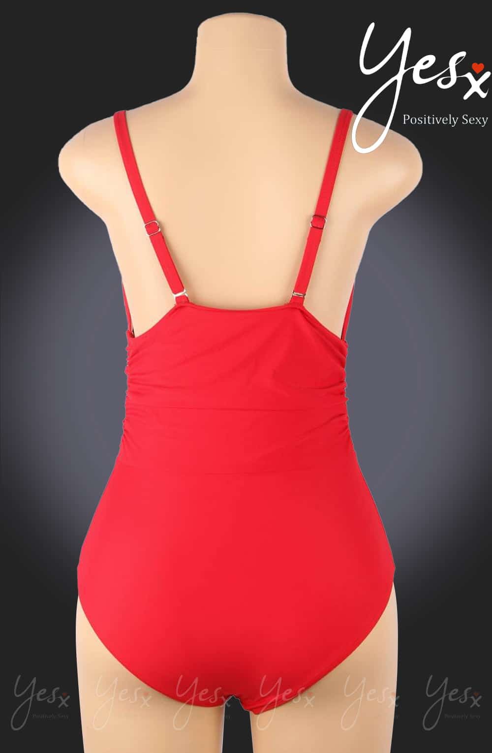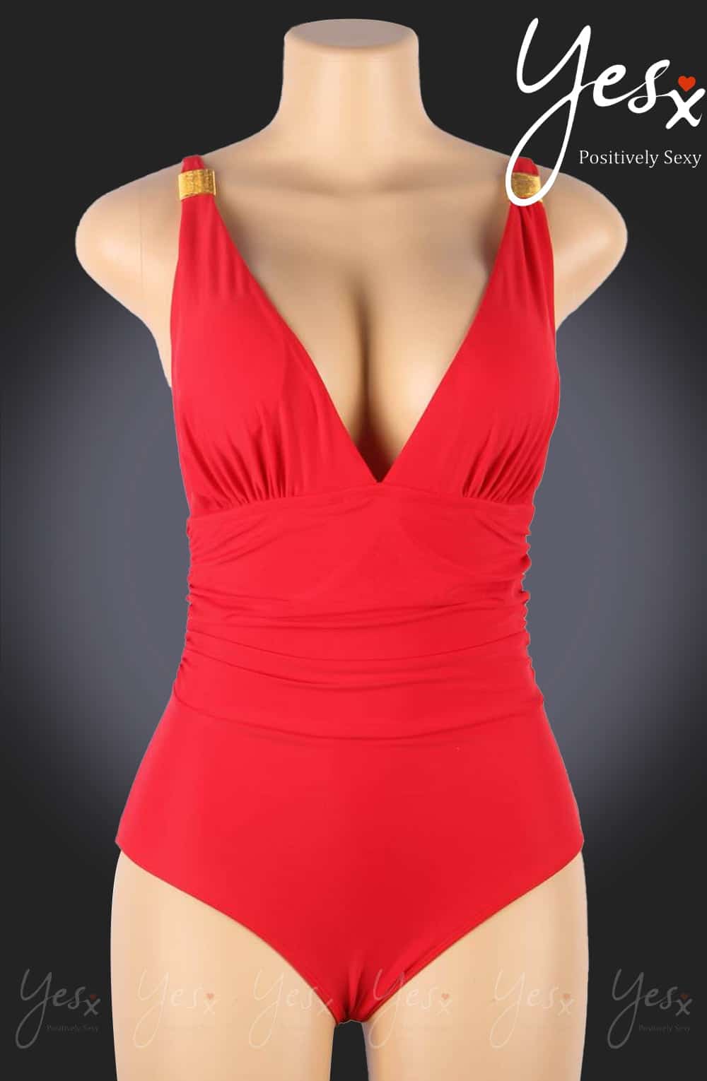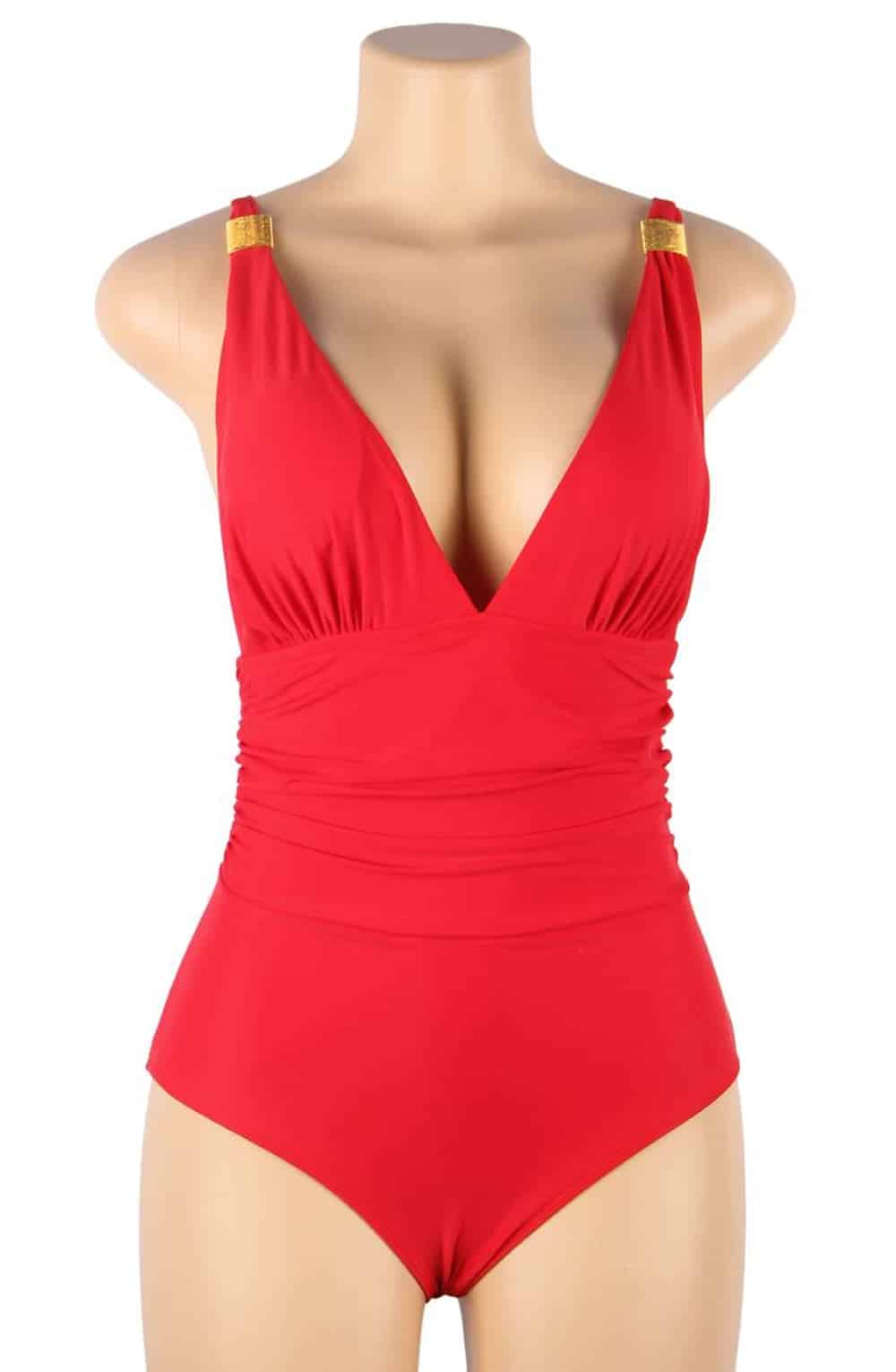 Stunning red plunging V-neck style swimsuit with ruched sides that is sure to enhance your curves. This swimsuit is wireless with removable padding and the straps are adjustable to achieve the perfect fit and feature elegant gold buckles. This item arrives packaged in a YesX satin bag.