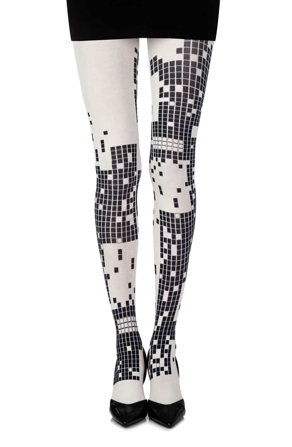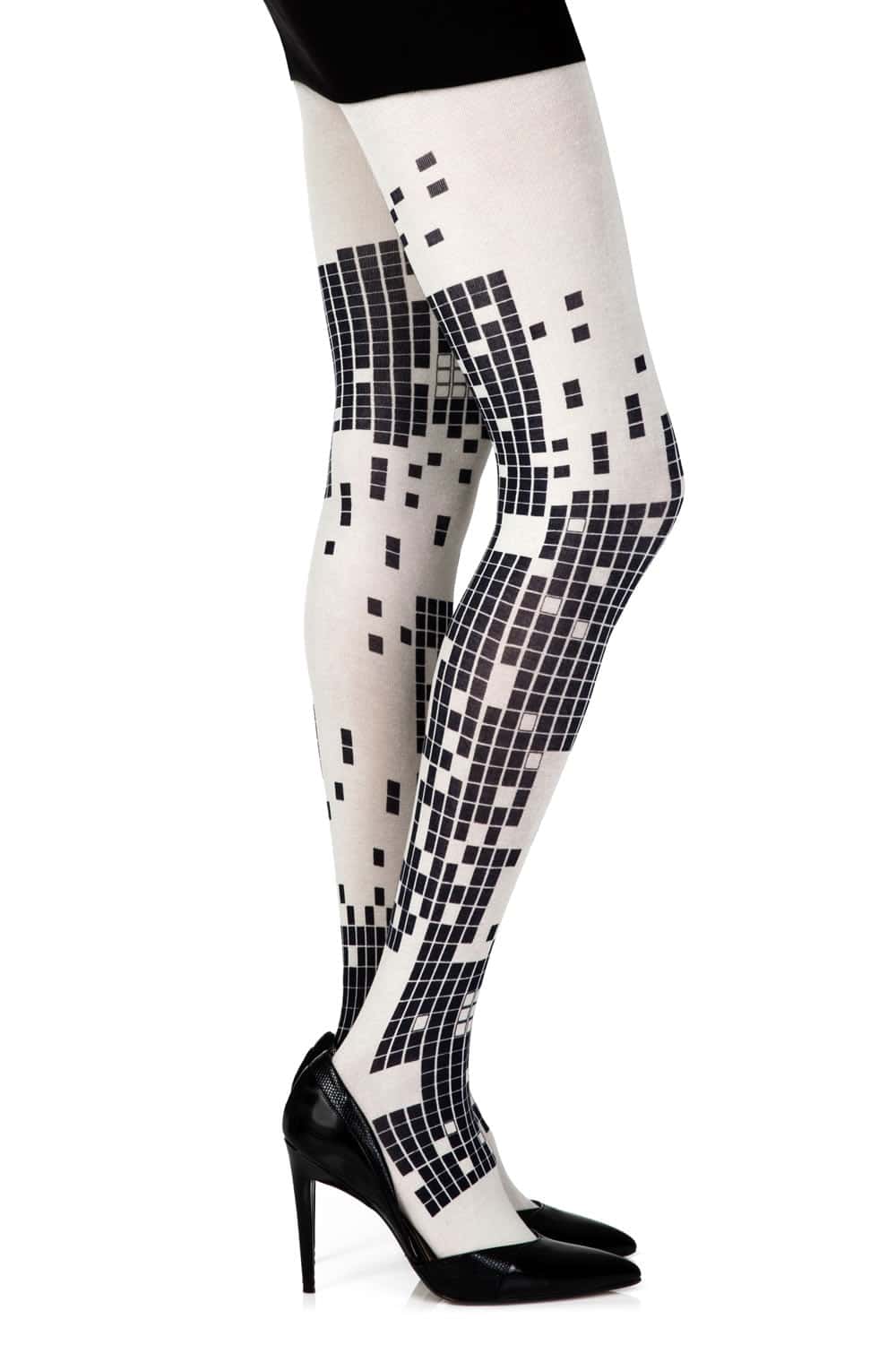 Opaque cream 100 denier reeve tights with black squares that look like a checkers game. The print is on both legs front and back.