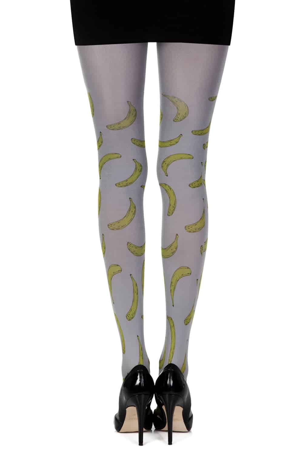 Opaque medium gray 120 denier tights with yellow bananas exotic print scattered along the legs. The print is on both legs front and back.