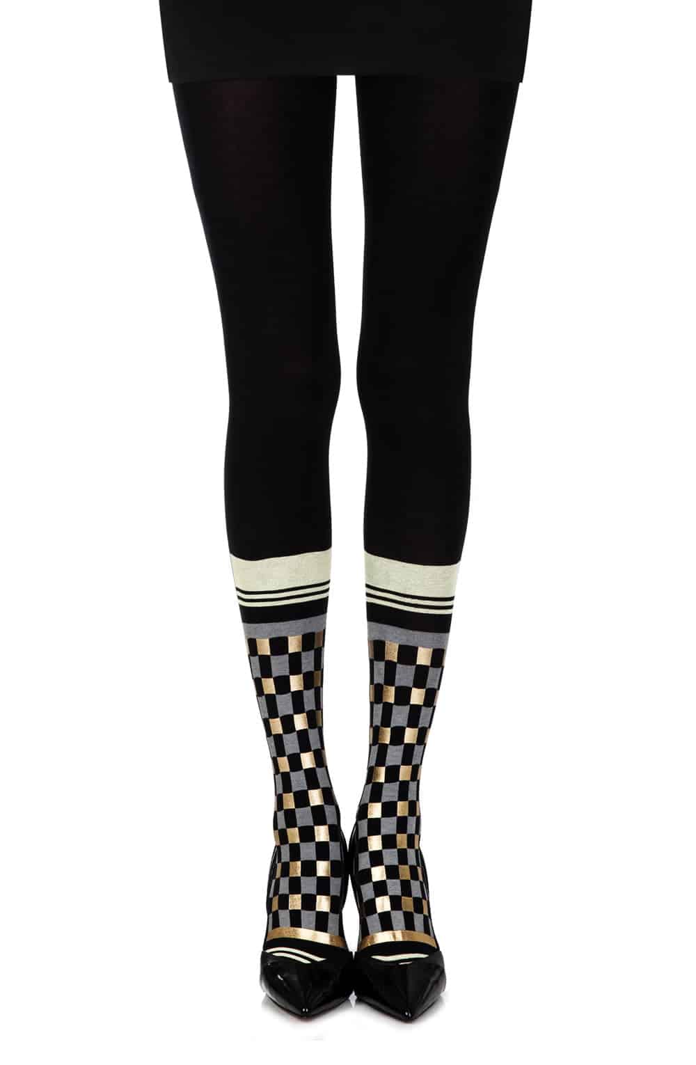 Opaque black 100 denier reeve tights with colorful socks print on the lower legs. The print is on both legs front and back.