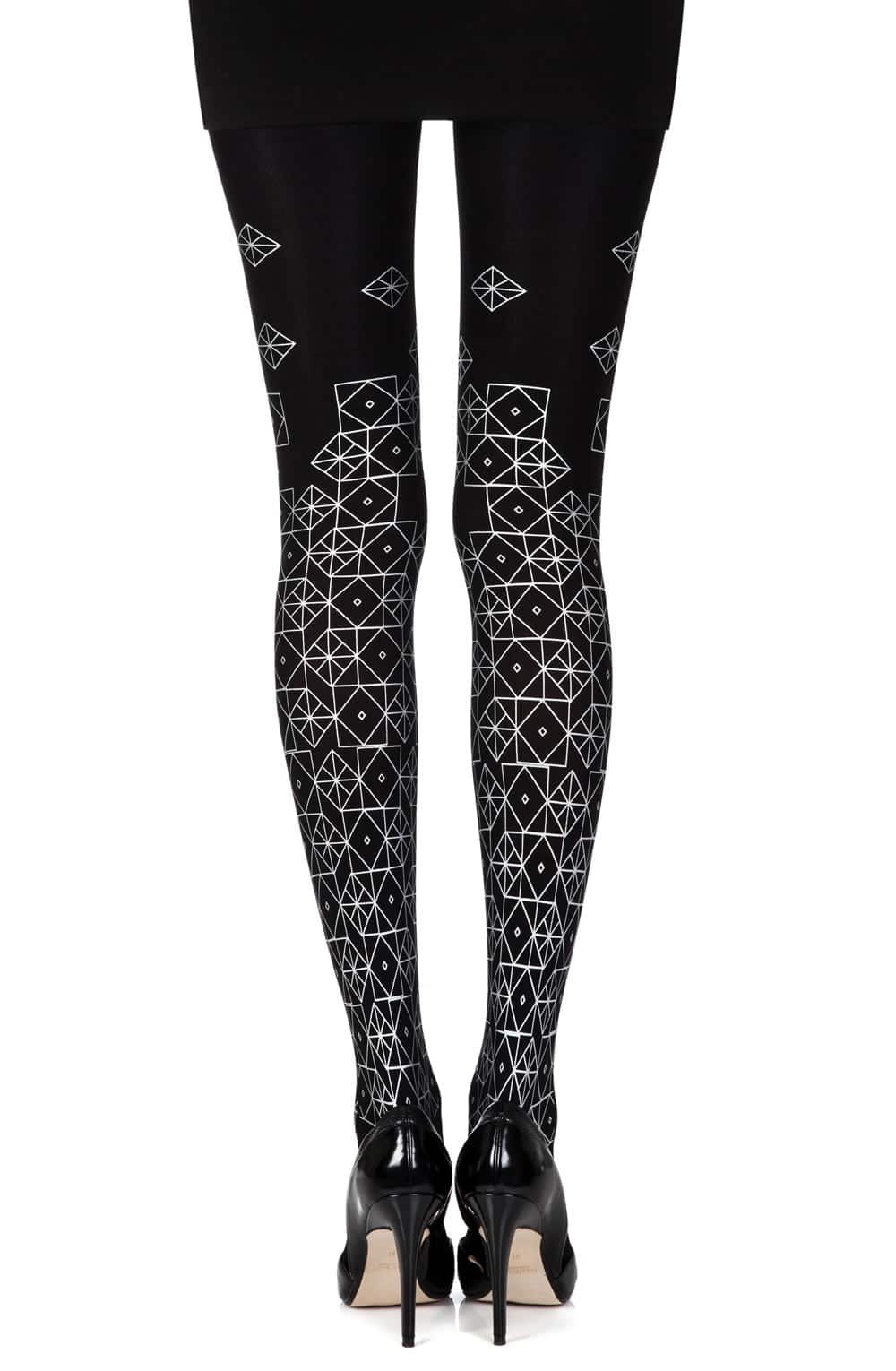 Opaque black 120 denier tights with artistic print of silver kaleidoscope along the legs. The print is on both legs front and back.
