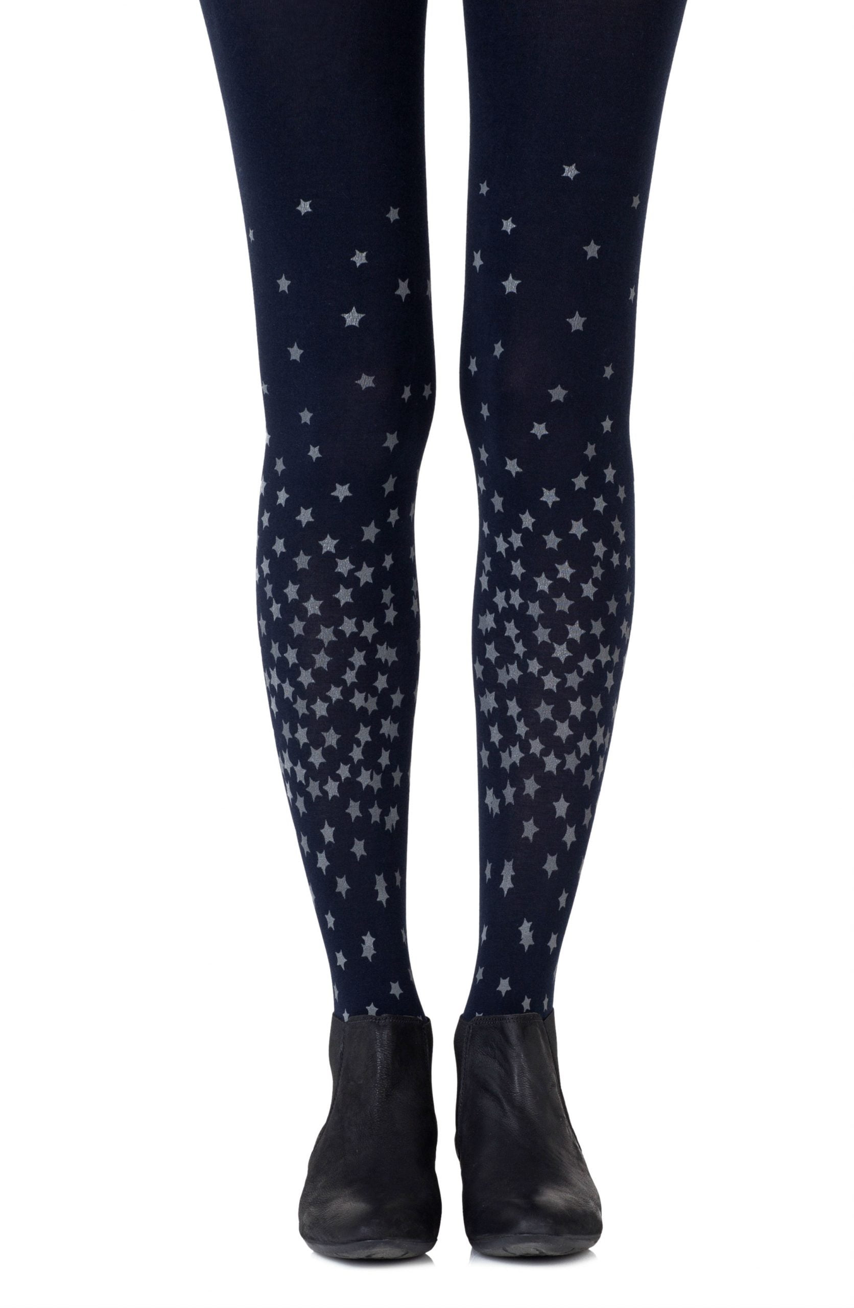 Stand out from the crowd with Rise and Shine tights that feature an allover star print. Colour: Navy tights with Grey print. Thickness: 100 denier. Your entire leg will be getting Zohara love with allover prints. Both sides are not created equal with allover tights so please look at the foot of the tights before wearing to ensure you don’t step on the print. (The front print will be lower than the back.) Made from Cotton. Unless they have X-ray vision no one will be able to see through these opaque tights. Hand print no two are the same.