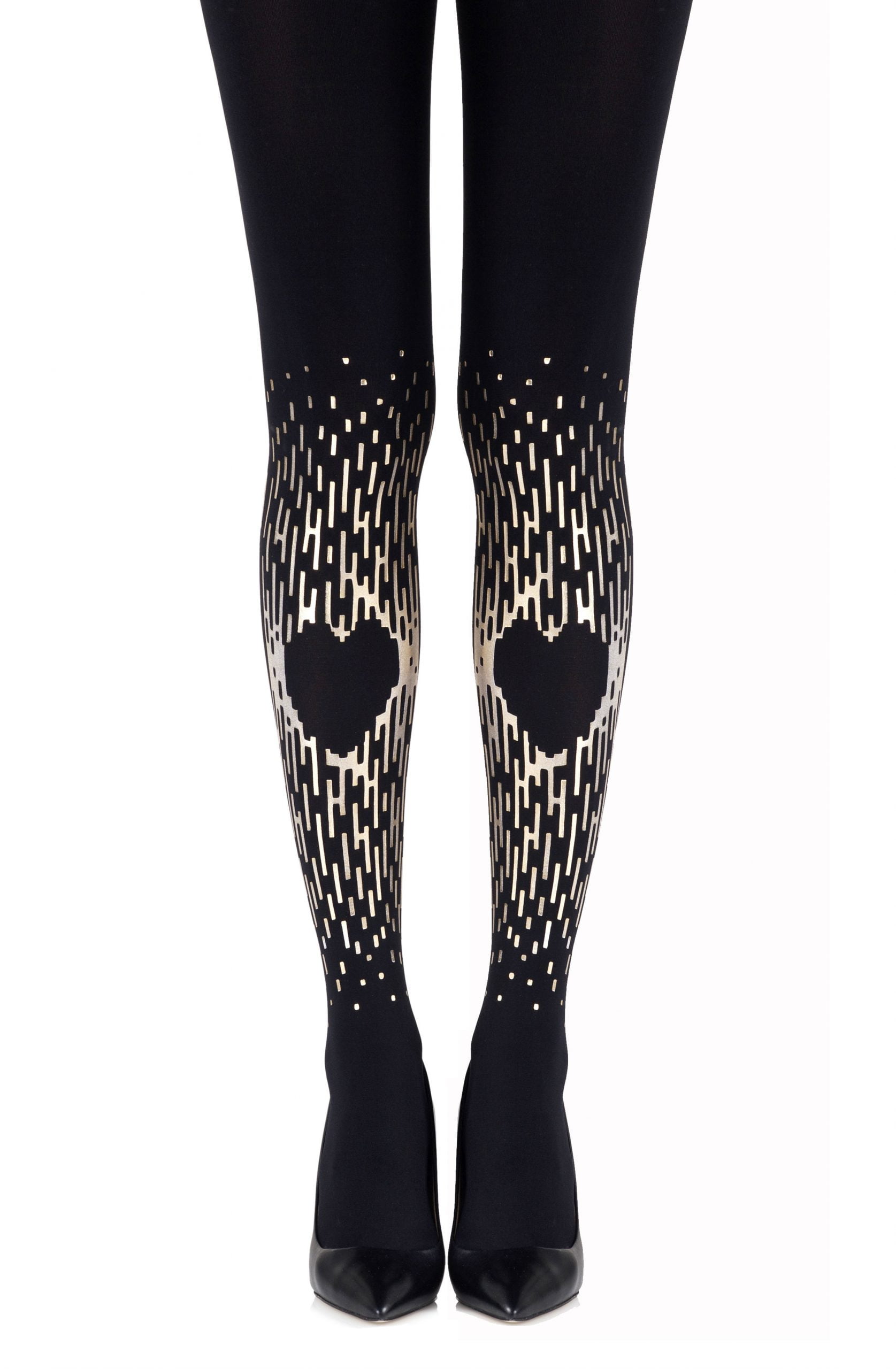 Love is all around with the Spread The Love tights that feature an emerging heart from an abstract graphic that is two-sided. We love actually. Colour: Black tights with Gold print. Thickness: 120 denier. No doubt you will shine with our metallic prints. Please note that these prints require extra care when washing and will naturally fade with wear. Unless they have X-ray vision no one will be able to see through these opaque tights. With an identical print on the front and back get ready for 360° visual impact. Hand print no two are the same.